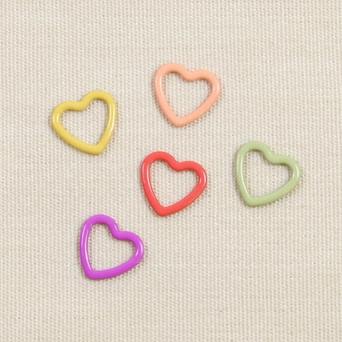 Fargeglade maskemarkører i lakkert metall med hjertefasong. Størrelse ca 15 mm.