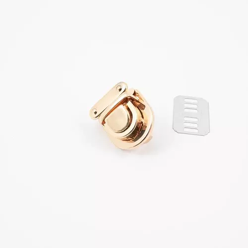 Veskelås i metall. Festes gjennom stoffet med en plate på baksiden. Toppen klemmes fast rundt kanten på veskelokket.