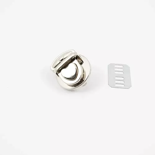 Veskelås i metall. Festes gjennom stoffet med en plate på baksiden. Toppen klemmes fast rundt kanten på veskelokket.